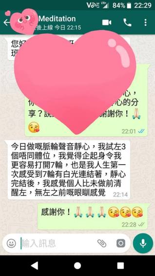 平日生活及工作壓力很大,故此上網搜尋「放鬆課程」,無意中發現Rashmi教授的靜心課程,上課時自己帶上眼罩投入地參與,並感到全身放鬆,過程中也排汗,將所有壓力完全釋放,這課程對比自己平時做的帶氧運動更能放鬆自己,感到身心靈平靜及健康。