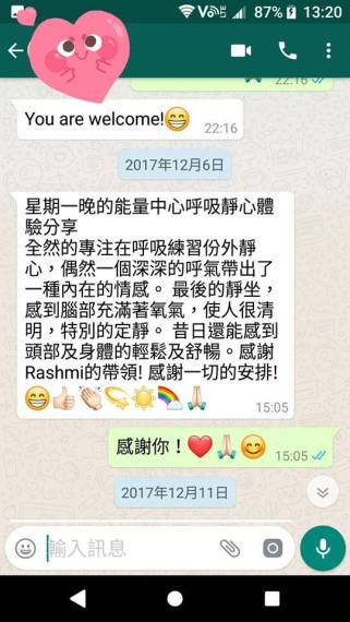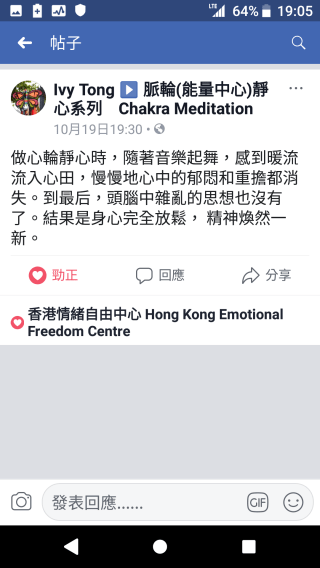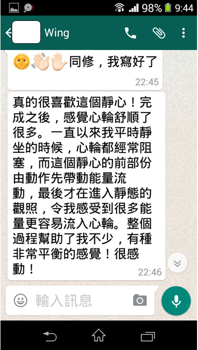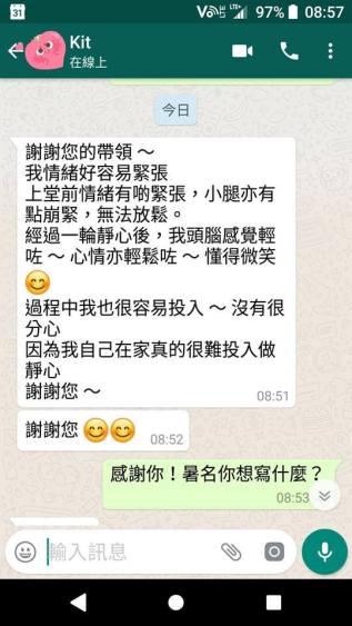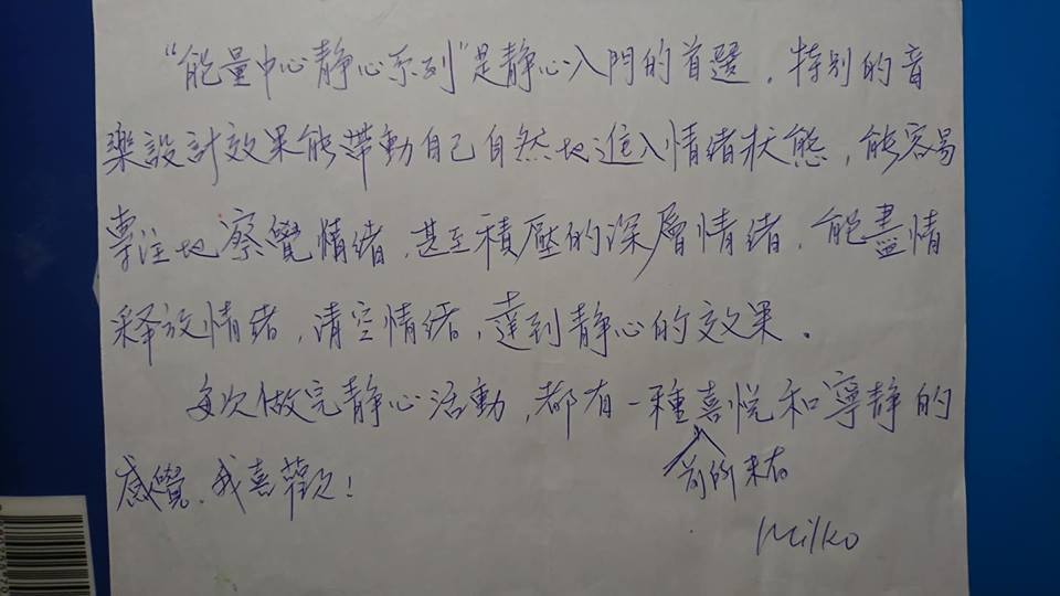 心輪靜心做完後身體感到舒服、放鬆,上課前的緊張不安消除了,感謝老師!